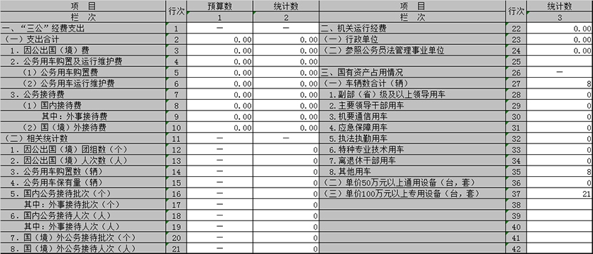 2.“三公”經(jīng)費填列單位使用一般公共預(yù)算財政撥款安排的支出,其中:中央單位不包括教學(xué)科研人員因公出國(境)費及相關(guān)團組和人次,地方單位按照本級部門預(yù)算口徑填報。預(yù)算數(shù)填列年初預(yù)算數(shù),支出統(tǒng)計數(shù)應(yīng)與財決08表保持銜接?!叭苯?jīng)費相關(guān)統(tǒng)計數(shù)是指使用一般公共預(yù)算財政撥款負擔(dān)費用的相關(guān)批次、人次及車輛情況。