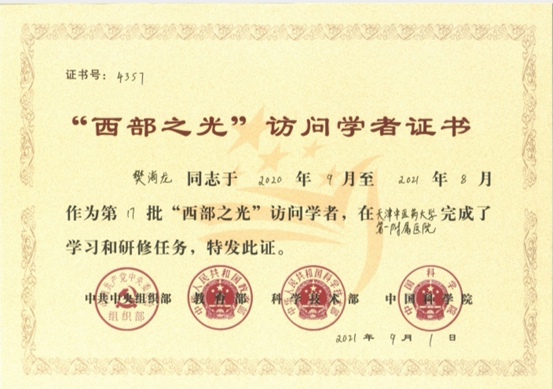 近日,中組部第十七批次“西部之光”訪問學(xué)者、呼和浩特市蒙醫(yī)中醫(yī)醫(yī)院樊海龍博士獲頒“西部之光”訪問學(xué)者證書。樊海龍博士表示:下一步將依托“石學(xué)敏國(guó)醫(yī)大師傳承工作室”,在院領(lǐng)導(dǎo)的支持下,落實(shí)好呼和浩特市人民政府“六大產(chǎn)業(yè)集群”建設(shè)項(xiàng)目之一“石學(xué)敏國(guó)醫(yī)大師傳承工作室建設(shè)項(xiàng)目”,把我院打造成“國(guó)家中醫(yī)針灸臨床醫(yī)學(xué)研究中心”分中心,貢獻(xiàn)自己一份綿薄之力。