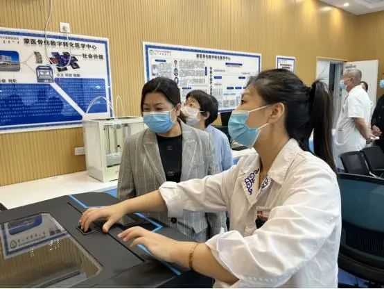 調研組首先來到中醫(yī)腦病科和蒙醫(yī)骨傷科門診現(xiàn)場查看項目推廣情況及效果,后到蒙醫(yī)骨傷科數(shù)字轉化實驗室參觀指導。